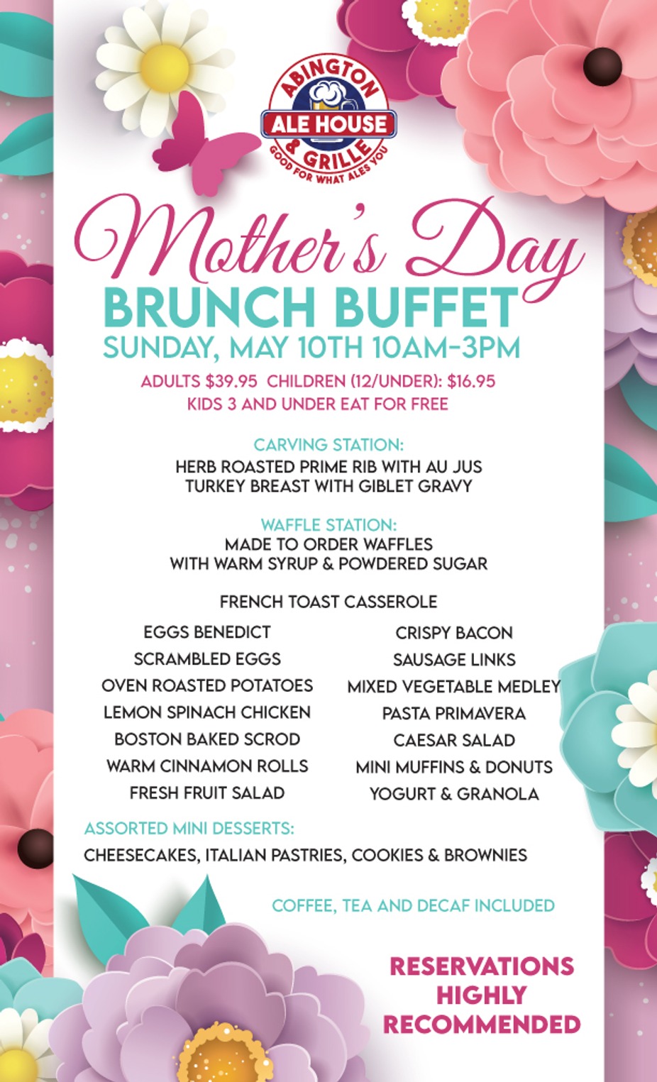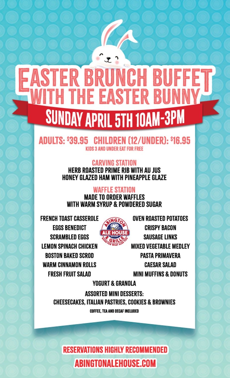 Easter Sunday Brunch Buffet! Come have brunch with the Easter Bunny, take pictures and enjoy some delicious food! Adults $ 39.95, Kids $16.95 and kids under 3 eat free! Make your reservations now!