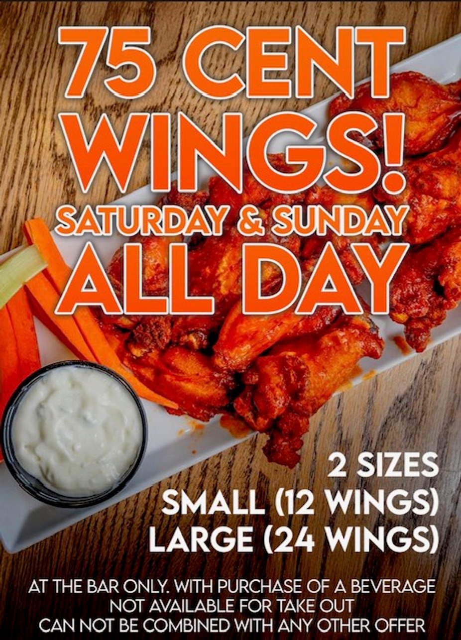 Do you like wings? Come sit at the bar on Saturdays and Sundays and enjoy $0.75 wings! Sold in two sizes small (12 wings) and large (24 wings). (Dine in only, with the purchase of a beverage, can not be combined with other offers)